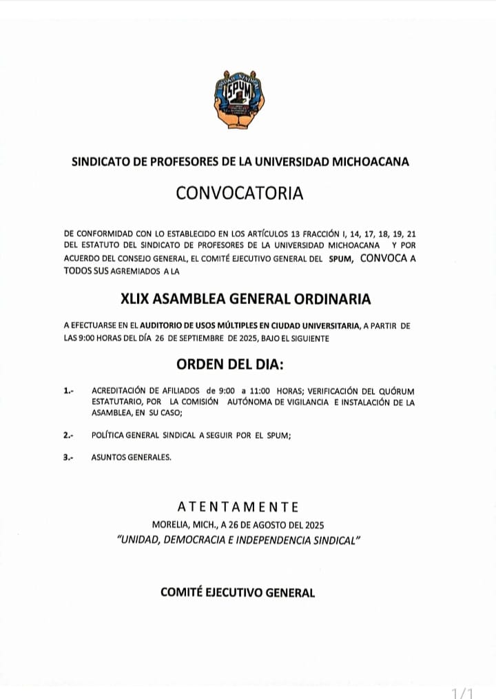 De conformidad con lo establecido en los artículos 13; fracción 1, 14, 17, 18, 19, 21 del estatuto del Sindicato de Profesores de la Universidad Michoacana y, por acuerdo de Consejo General, el Comité Ejecutivo General del SPUM CONVOCA a todos sus agremiados a su XLIX Asamblea General Ordinaria, que se llevará a cabp en el auditorio de usos múltiples en Ciudad Universitaria a partir de las 09:00hrs del día 26 de septiembre de 2025. Preséntate a tu sección sindical para obtener los detalles del evento. El SPUM lo contruimos todos. Descarga la convocatoria en este link